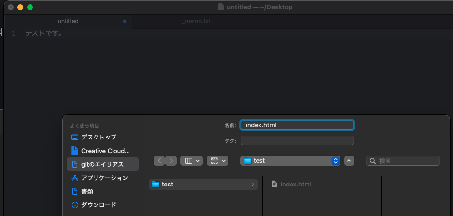 「index.html」という名称でtest/ 配下に保存をしましょう。